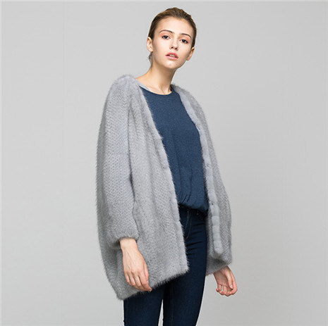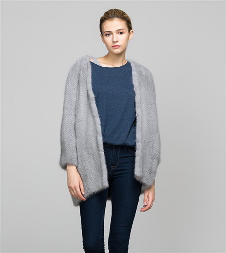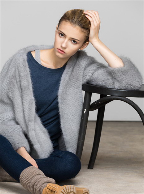 水貂毛中长款V领毛衣外套